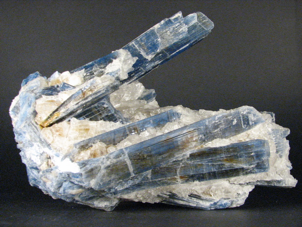 Modré průhledné lištovité krystaly kyanitu v křemeni. Barra de Salinas, Brazílie. Velikost vzorku 14×10 cm. Sbírky Geologického pavilonu VŠB-TU Ostrava, foto J. Jirásek 2010.