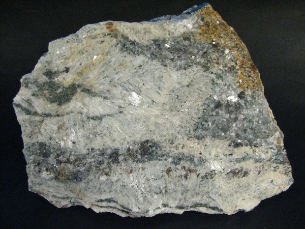 Radiálně paprsčitý bílý wollastonit. Staré Podhradí. Velikost vzorku 10,5×8,5 cm. Sbírky Geologického pavilonu VŠB-TU Ostrava, foto J. Jirásek 2010.