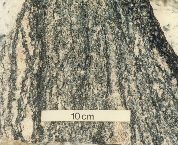 Granoblastická struktura migmatitu s lokálně roztroušeným molybdenitem.