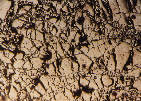 Kataklastická struktura galenitu. Mefis, Maroko. Nábrus, šířka 1 cm. Sbírka P. Ramdohr, foto P. Láznička, 1988.