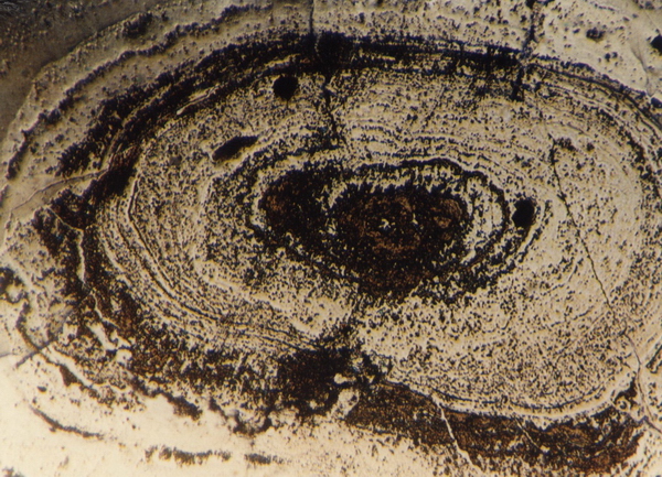 Koncentricky zonální struktura v pyrolusitovém pisolitu.