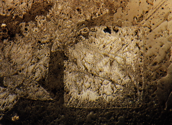 Nerovnoměrně zrnitá struktura. Velké vyrostlice krystalů (metakrysty) vzniklají metasomatickým růstem v jiném minerálu nebo hornině z hydrotermálních roztoků. Zde metakryst uraninitu v ankeritu. Lwiwishi, Demokratická republika Kongo. Sbírka P. Ramdohr, foto P. Láznička, 1988.