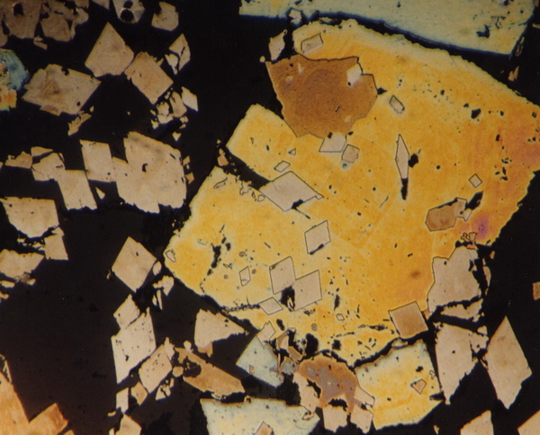 Klence (idioblasty) arsenopyritu jsou poikiliticky uzavřeny v pyritu.