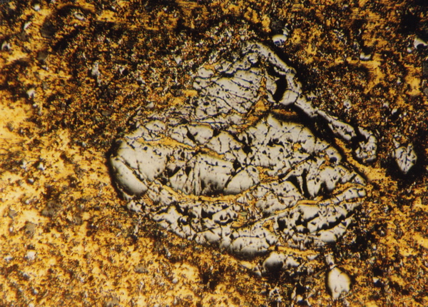 Struktura Durchbewegung („prohnětená“) ze skupiny fragmentovaných struktur. Obvyklá v tlakově metamorfovaných rudách, zejména ve střižných zónách. Relikt kataklastického magnetitového porfyroklastu „plave“ v duktilní pastě pyrhotinu a pentlanditu Monchegorsk, Kola, Rusko. Nábrus, šířka 1 cm. Sbírka P. Ramdohr, foto P. Láznička, 1988.