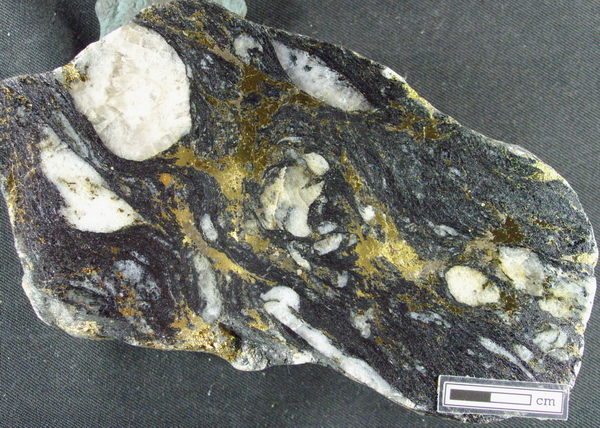 Nehomogenní dynamometamorfogenní struktura typu Durchbewegung („prohnětená“), kde sulfidy (chalkopyrit, pyrhotin) tvoří prožilky (angl. stringers) ve fylonitu vzniklém z bazaltu. Bílé jsou porfyroklasty křemene. Mosaboni, Singhbhum, Indie. Měřítko v cm. Sbírka D. Kirwin, foto P. Láznička, 2008.