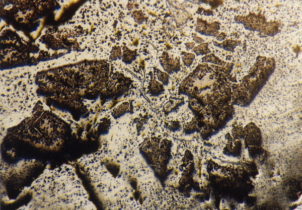 Braunit (hnědý) tvoří relikty v mladším pyrolusitu a manganitu, které ho zatlačily.