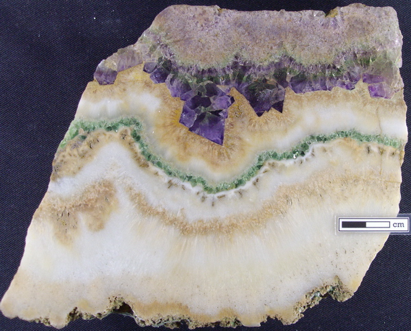 Koncentricky zonální struktura fluoritu (bílý, žlutý, zelený) je přerušená skupinou fialových krychlových krystalů téhož. Yingyu, Čína. Měřítko v cm. Sbírka D. Kirwin, foto P. Láznička, 2008.