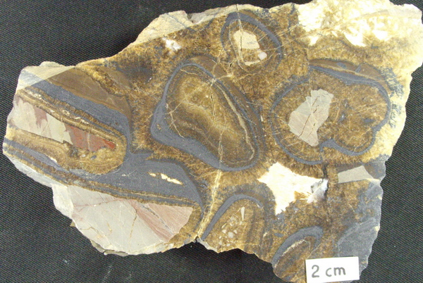Úlomky ranné žiloviny tvoří ostrůvky obklopené bílým křemenem a světle šedým dolomitem. Eunsan, Jižní Korea. Měřítko v cm. Sbírka D. Kirwin, foto P. Láznička, 2008.