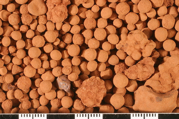 Bobová (pisolitická) textura, necementovaná. „Kuličky“ téměř uniformní velikosti jsou z gibbsitu (jeden z minerálů bauxitu) a vznikly v tropickém zvětrávacím profilu. Gove, Severní teritorium, Austrálie. Měřítko v cm. Sbírka NT Geological Survey & P. Láznička, foto Data Metallogenica.