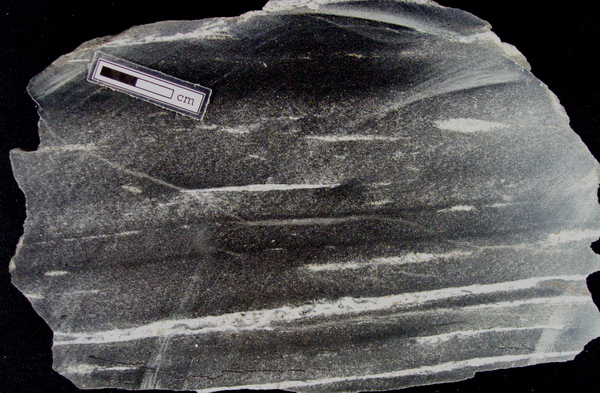 Původní černá břidlice, posléze metamorfovaná, obsahuje proužky křemen (bílý) a velmi jemného chalkozínu.