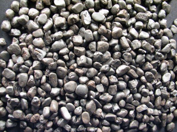 Šedé valounky rutilu vybrané z těžkého podílu náplavů potoka. Vestřev. Velikost největšího zrna 1 cm. Sbírka J. Jiráska, foto J. Jirásek 2009.