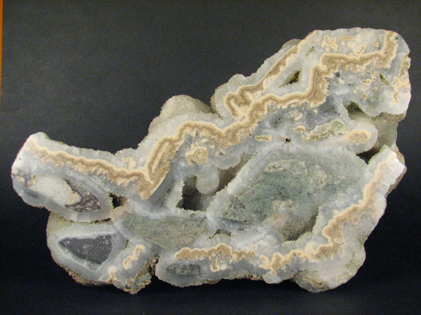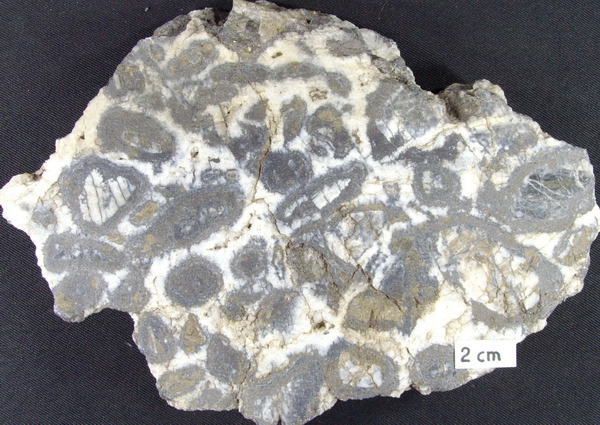 Úlomky vulkanické horniny obalené zrny chalkopyritu, galenitu, sfaleritu a pyritu (tmavé) a následně křemenem. Banská Štiavnica, důl Michal, Slovensko. Velikost vzorku 13,5×7 cm. Sbírky Geologického pavilonu VŠB-TU Ostrava, foto J. Jirásek 2010.