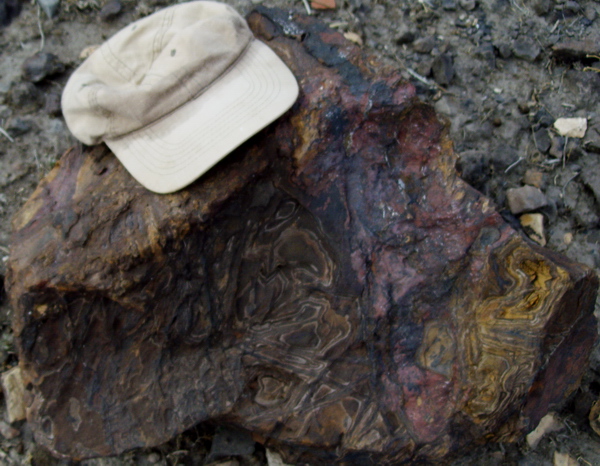 Metakolomorfní goethit vzniklý oxidací sideritu, rytmicky vyloučený blízko povrchu.