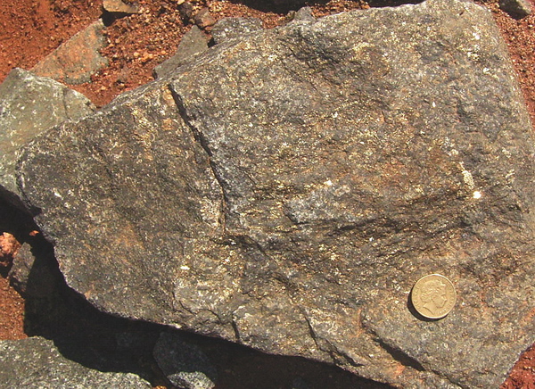 Zlatonosný pyrit je vtroušený paralelně s trhlinami v granodioritu. Ravenswood, Queensland, Austrálie. Foto P. Láznička, 2007.