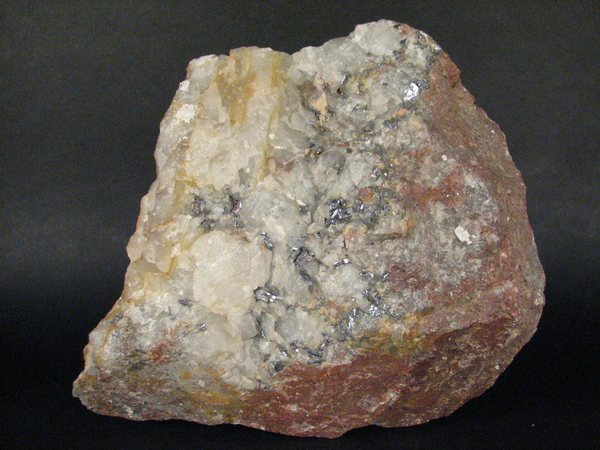 Vtroušené kovově lesklé šedé lupínky molybdenitu v křemeni. Krupka. Velikost vzorku 13,5×7 cm. Sbírky Geologického pavilonu VŠB-TU Ostrava, foto J. Jirásek 2010.