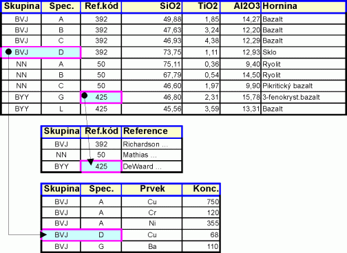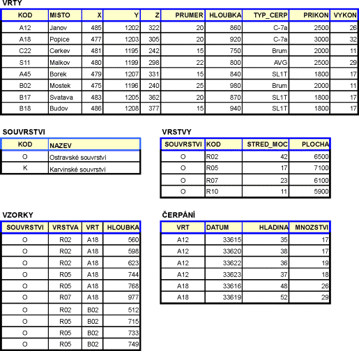 Jako příklad budeme uvažovat uvedenou část modelové databáze geologických souvrství. Konkrétně půjde o tabulky VZORKY, VRSTVY, SOUVRSTVÍ.