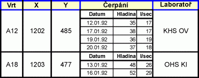 Předchozí obrázek znázorňuje soubor s informacemi o podzemních vodách. Záznam je tvořen informacemi o jednom vrtu. Má šest segmentů: Kód vrtu, Poloha, Čerpadlo, ..., Chemismy. První segment je tvořen jediným polem. Segmenty Čerpání a Chemismy mají charakter násobného, opakujícího se segmentu, tj. mohou být přítomny vícekrát. Je samozřejmé, že - až na řídké výjimky - je počet záznamů v souboru vždy proměnný, stejně jako počet násobných segmentů v záznamu. Omezení shora je dáno především kapacitou média.
