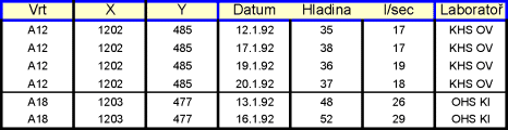 Výstupní tabulka bude mít tři sloupce. První (se jménem VRT) bude obsahovat kód vrtu společný všem řádkům skupiny. Druhý (se jménem DOLE) bude obsahovat nejmenší z hodnot HLOUBKA v této skupině. Analogicky třetí sloupec (se jménem NAHORE) bude obsahovat největší z hodnot HLOUBKA v této skupině.