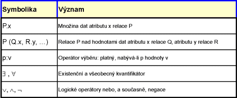 Tyto a další operace vytváří algebru relací. Kromě operací lze vytvářet další relace také relačním kalkulem. Přitom se využívá symboliky používané obdobně v jiných partiích matematiky (obr. 3.8).