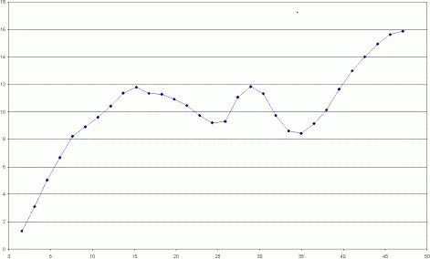 Výsledná databáze může pak být přímo zpracována vhodným programem do grafického tvaru -semivariogramu. Uvedeným dotazem byla vytvořena tabulka semivariancí hodnot zinku získaných z vertikálního vrtu s krokem 52 [m], kterou vykreslil program Excel do grafu na obr.3.X. V tomto případě šlo o lineární strukturu, proto hodnoty XX byly hloubkové údaje, hodnoty YY byly všechny rovny nule.