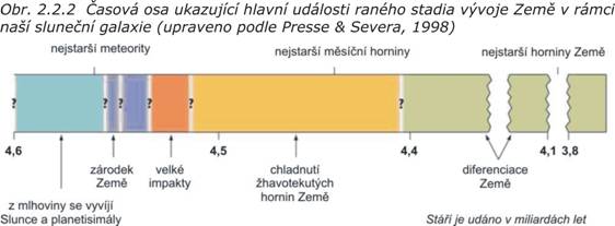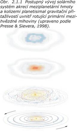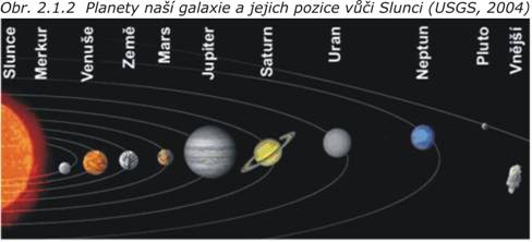 I když je, jak bylo uvedeno výše, absolutní převaha hmoty koncentrována v jádru Slunce, ze zbývající hmoty galaxie dochází postupně ke vzniku planet. Tento „okamžik“ je, na podkladě absolutního datování stáří meteoritů dopadajících na Zemi, určen na 4,56 miliard let. Významný rozdíl přitom je mezi planetami (obr. 2.1.2), jejichž oběžné dráhy jsou bližší Slunci (tzv. vnitřní planety – Merkur, Venuše, Země a Mars - terestrické planety) a těmi, jejichž dráhy jsou Slunci vzdálenější (obří vnější planety – Jupiter, Saturn, Uran a Neptun).