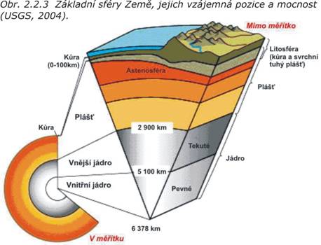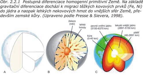 Postupnou gravitační diferenciací vnitřní hmoty Země, doprovázenou migrací lehkých hmot do vnějších a těžkých do vnitřních sfér, se konstituovala základní sférická zonálnost naší planety. Od povrchu do nitra Země lze vymezit postupně zemskou kůru, plášť a jádro (obr. 2.2.1 a 2.2.3). Železo, které od počátku vzniku Země reprezentovalo přibližně třetinu jejího objemu, spolu s některými dalšími kovovými prvky, především niklem, migrovalo v důsledku gravitační diferenciace do jejího nitra (obr. 2.2.1). Tento proces podmínil vytvoření zemského jádra. Díky vývoji (nárůstu) vnitřních teplot a tlaků Země je vnější jádro ve stavu taveniny – tekuté a vnější jádro pevné.