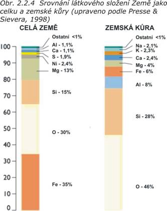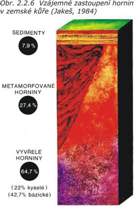 Celkové látkové složení kontinentální kůry reprezentuje obr. 2.2.4. Dominantními minerály kůry jsou především křemičitany (silikáty), oxidy a uhličitany. Mezi horninami výrazně dominují magmatity (obr. 2.2.6).