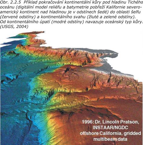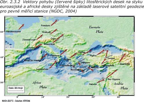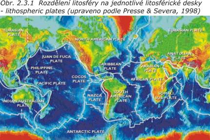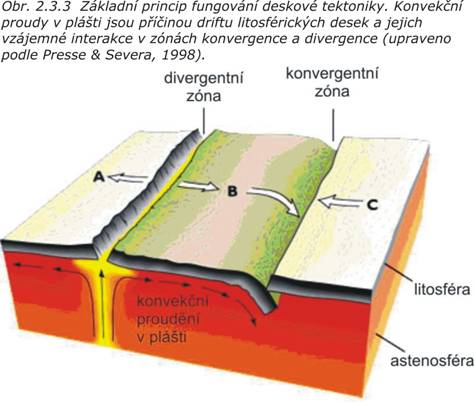Jak ukázaly především geofyzikální výzkumy probíhající od počátku 60. let 20. století, není litosféra homogenní a izotropní svrchní obálkou Země. Především výsledky seismiky, zvláště přesná 3-D lokalizace hypocenter zemětřesení, indikují rozdělení zemské litosféry do řady velmi rozdílných a velikostí značně diferencovaných litosférických desek (obr. 2.3.1). Důkazy o změně pozic – kontinentálním driftu litosférických desek v průběhu geologického vývoje přinášel již na počátku 60. let např. paleomagnetický výzkum, spolu s absolutním datováním hornin oceánské kůry. Současná satelitní geodézie posledních dvou dekád poskytuje stále nové, velmi přesné údaje o jejich aktuálním pohybu (obr. 2.3.2). Příčiny driftu jsou všeobecně odvozovány od tzv. konvekčních proudů v zemském plášti (obr. 2.3.3) a souvisí nepochybně s výstupem tepla ze zemského jádra a pláště k povrchu. V důsledku aktivity těchto proudů dochází nad místy jejich výstupu k divergentnímu pohybu (rozpínání – pohyb od sebe) sousedních litosférických desek. Divergentní desková rozhraní jsou lokalizována především v středooceánských riftových zónách (obr. 2.3.4), ale také v oblastech kontinentálních riftových zón (např. východoafrický riftový systém).