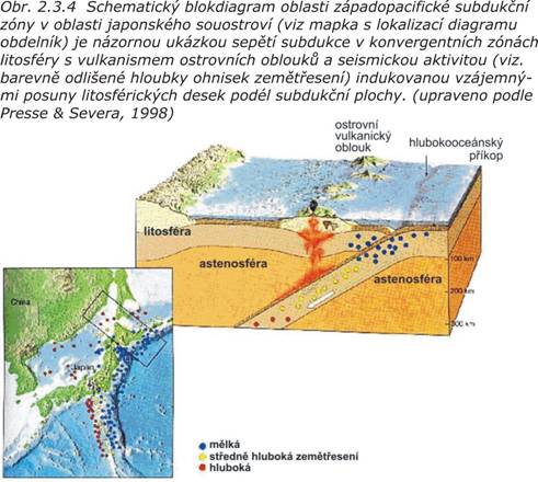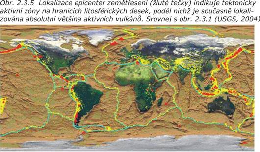 Lokální koncentrací napětí v zemské kůře a plášti v důsledku tektonických pohybů jednotlivých desek dochází ke vzniku tektonických zemětřesení – přirozené seismicity (obr. 2.3.5 a video - Příklad sesuvů vzniklých zemětřesením, Doubtfull Sound, Nový Zéland). Ohniska zemětřesení jsou lokalizována především v tektonicky aktivních oblastech - zónách divergence a zónách konvergence. Aktivní desková rozhraní jsou současně centry magmatismu, zejména efuzivní vulkanické aktivity. Nad zónami subdukce, v důsledku tavení korových hornin podsouvaných litosférických desek, se vyvíjí tzv. vulkanické ostrovní oblouky. Současně dochází v zónách divergence - v riftových pásmech středooceánských hřbetů, k podmořskému čedičovému vulkanismu, který zaplňuje prostor – „trhliny“ po vzdalujících se (divergujících) litosférických deskách.