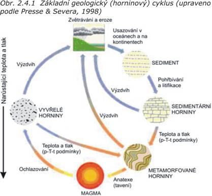 Teorie deskové tektoniky vysvětluje hlavní principy vývoje litosféry a především zemské kůry, která je našemu pozorování a využití relativně nejlépe přístupná. Všechny procesy (tektonické, magmatické atd.) odehrávající se pod povrchem Země se zahrnují do skupiny tzv. endogenních geologických procesů (viz. kap. 7 - Magmatismus). Dále se na utváření zemského reliéfu (georeliéfu) podílejí vlivy atmosféry a hydrosféry a dynamika probíhajících procesů. Významně působí zejména na zvětrávání hornin, následný transport (aktivitou vody, větru, mj. v důsledku působení gravitace a slunečního záření) a sedimentaci. Náleží do skupiny exogenních geologických procesů (viz. kap. 8 – Působení exogenních procesů na Zemi). Vzájemnou interakci obou demonstruje schematické zobrazení základního geologického cyklu (obr. 2.4.1). Toto schéma současně názorně vysvětluje petrografické rozdělení hornin ve vztahu k jejich genezi do tří základních skupin (horniny magmatické – vyvřelé, sedimentární - usazené a metamorfované – přeměněné).