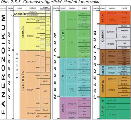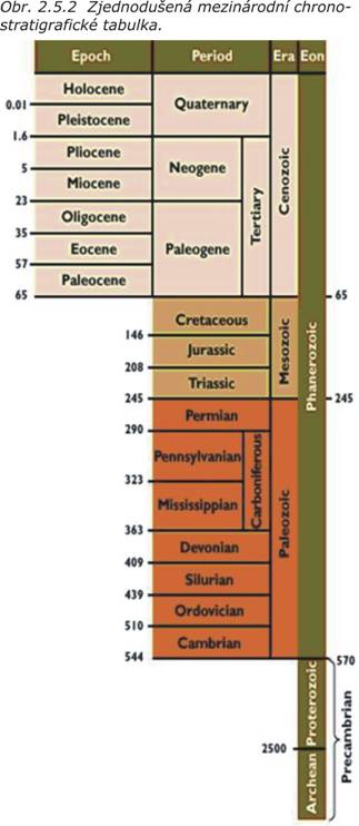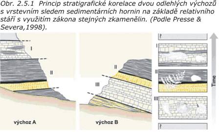 V běžné geologické praxi však postačí stanovit relativní stáří (obr.2.5.1). Znamená to určit, zda je daná konkrétní hornina mladší, nebo starší než jiná. Totéž platí i o stáří zlomů, vrásových deformací, geologických těles a formací. Zde je rozhodující paleontologická metoda využívající nálezů zkamenělin v sedimentárních horninách. Paleontologie spolu s některými sedimentologickými metodami poskytuje možnost sestavit chronostratigrafickou tabulku (obr. 2.5.2).