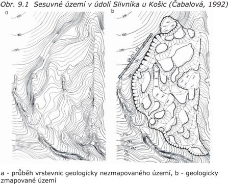 Geomorfologické studie se využívají již během počátečních etap průzkumu a to zejména při rozhodování o výstavbě rozsáhlých a náročných inženýrských děl. Představují jednu z nejlevnějších metod výzkumu, která umožňuje již např. z topografických map, geomorfologických map ale i leteckých snímků a samotné prohlídky terénu určit možný výskyt rizik a obtíží. Např. v údolí Slivníka u Košic lze z průběhu vrstevnic (obr. 9.1) usuzovat na výskyt svahové deformace a je možné také odhadnout rozsah sesuvného území.