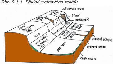 Reliéf svahový (obr. 9.1.1) je výsledkem deluviálních (svahových) procesů. Patří sem všechny druhy svahových pohybů jako např. stékání, ploužení, sesouvání a řícení.