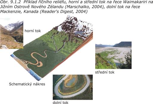 Výsledkem erozní a akumulační činnosti vody je říční reliéf (obr. 9.1.2, viz. kap. 8.2.2 - Geologická činnost tekoucí vody ), jehož nejvýraznější formou jsou říční údolí. Řeky stékají z výše položených míst, jako jsou hory nebo kopce aj., dolů do nížin a formují krajinu různou intenzitou. Na základě toho lze na toku vymezit tři úseky. Na horním toku převládá vertikální eroze v důsledku často vysokého spádu a také značné rychlosti proudění vody. Střední tok je kromě vertikální eroze charakterizován také boční erozí a svahovými pohyby. V důsledku mírnějšího spádu na středním toku dochází i k akumulační činnosti řeky a k vytváření aluviální nivy. Dolní tok je typický širokým a plochým údolím s mírnými svahy. V tomto úseku je velmi mírný spád, řeka nanáší hlavně jemnozrnný materiál a hloubí si koryto ve vlastních náplavech. Častý je výskyt meandrů a mrtvých koryt.