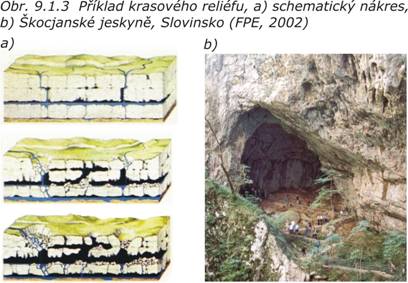 Rozpouštěním lehce rozpustných hornin (vápenců, sádrovců, dolomitů a jiných karbonátových hornin), působením podzemní a povrchové vody, obohacené o rozpustný CO2, vzniká krasový reliéf (obr. 9.1.3). Jedná se o chemickou erozi, která je u nás nejrozšířenější ve vápencích – vápencový kras. Rozpouštění vápenců probíhá podle rovnice CaCO3 + H2O + CO2 «Ca(HCO3)2. Výsledkem je vznik krasových forem jako např. škrapy, závrty, propasti, dutiny, jeskyně aj. (viz. kap. 8.5 - Geologická činnost podzemní vody).