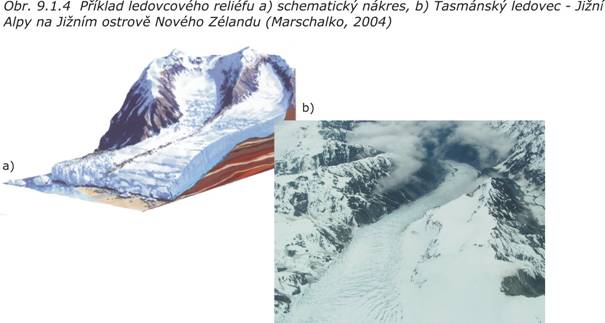 Ledovcový reliéf vzniká geologickou činnosti ledovců (obr. 9.1.4, viz. kap. 8.6 - Geologická činnost ledu a ledovců). Ledovce se vytvářejí nad tzv. sněžnou čárou (trvalá sněhová pokrývka) postupnou rekrystalizací čerstvého sněhu. Po určitém čase se může ledovec pod vlastní tíhou začít pohybovat směrem do údolí a působit erozi (ohlazování, odlamování a rýhování - viz. video - Příklad rýhování skalního podloží ledovcem) skalního podloží a následný transport (viz. video - Bludný balvan, Nový Zéland) a akumulaci úlomků hornin různé velikosti.