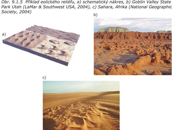 Větrný reliéf (obr. 9.1.5, viz. kap. 8.7 - Geologická činnost větru) je výsledkem geologické činnosti větru. Ten se může na tvorbě reliéfu podílet buď nepřímo (rozvlněná hladina porušuje břehy řek, nádrží atd.) anebo přímo procesem eroze (vyvátí drobných zrn ze sypkých sedimentů, obrušování skalních hornin částečkami unášenými větrem) a akumulace (ukládání transportovaných částic za vzniku celé řady akumulačních forem, např. duny, přesypy, barchany atd.).
