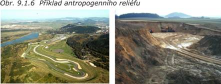 Lidskou činností vzniká antropogenní reliéf (obr. 9.1.6), např. reliéf vzniklý v důsledku těžby užitkových nerostů nebo městský reliéf, který představuje extrémní případ území zcela změněného činností člověka. Zdaleka nejde pouze o změny reliéfu a obrovské přesuny zemin a stavebních materiálů, ale o skutečnou tvorbu "městské krajiny" s novou sítí toků, změněnou úrovní spodních vod, ale také s novými společenstvy kosmopolitních dřevin atd.