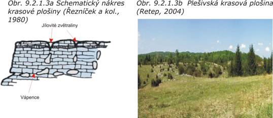 Krasové plošiny (obr. 9.2.1.3a,b) jsou typické pro území, kde se vyskytují mohutná souvrství horizontálně uložených vápenců. Vápence vystupují obvykle na povrch, který je porušen škrapovými poli a závrty, vyplněnými jílovitými zvětralinami. Z hlediska zástavby se jedná o nepříznivé území z důvodu nebezpečí provalení stropů podzemních krasových prostor.
