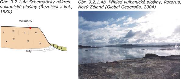 Vulkanické plošiny (obr. 9.2.1.4a,b) se vytvořily na horizontálně anebo subhorizontálně uložených sopečných horninách. Na lávových proudech nebo příkrovech se obvykle zachovaly pouze v reliktech v podobě stolových hor. Okraje vulkanických plošin by se neměly zastavovat, neboť se jedná o území ohrožené svahovými pohyby.