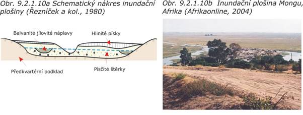 Inundační plošiny (obr. 9.2.1.10a,b) jsou zarovnaná území v okolí vodních toků, jejichž povrch je tvořen hlinitými zeminami (povodňové hlíny) s vysokým obsahem organických látek. Území bývají velmi často zaplavována a základové půdy jsou málo únosné a silně stlačitelné.