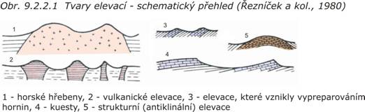 Hlavní tvary reliéfu lze rozdělit do následujících skupin (Prosová, Zeman, 1974): plošiny, elevace, deprese, svahové a antropogenní tvary.