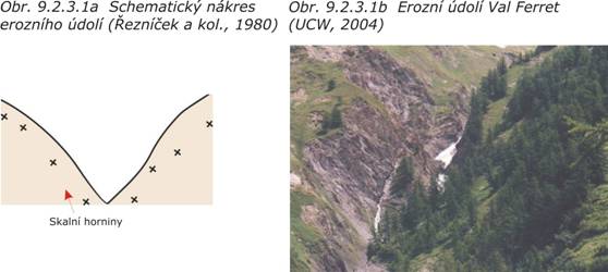Erozní údolí (obr. 9.2.3.1a,b) se vyskytují v horních částech toku a mají často tvar písmene V. Chybí akumulace zvětralin a na povrch vystupují skalní horniny, které mohou způsobovat při zemních pracích řadu obtíží, např. obtížnou těžitelnost, nebezpečí podkopání svahu, zatopení staveniště atd.