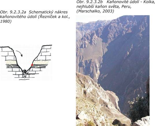 Relativně úzká kaňonovitá údolí (obr. 9.2.3.2a,b) se vyvinula převážně ve vápencích a pískovcích erozní činností řek. Pro výstavbu poskytují pouze omezený prostor a podél úpatí svahu je nebezpečí svahových pohybů.