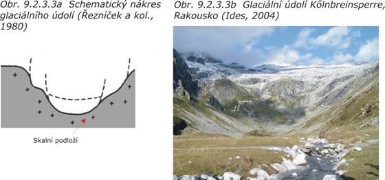 Glaciální údolí (obr. 9.2.3.3a,b) se vyskytují ve vysokohorských oblastech, kde byla vymodelována činností ledovců. V příčném řezu mají tvar písmene U . Jejich dno je vyplněno morénami, které poskytují nestejnorodé základové půdy (viz. video - Jižní Alpy, Nový Zéland).