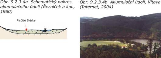 Akumulační údolí (obr. 9.2.3.4a,b) představují široká údolí, která se vyvinula ve střední a dolní části toku. Pokud mají charakter akumulačních terasových plošin jsou podmínky pro zástavbu příznivé, nepříznivé jsou v případě inundačních (záplavových) území v údolní nivě.