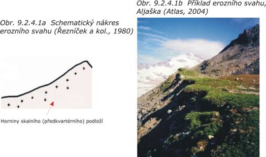 Erozní svahy (obr. 9.2.4.1) se vyvinuly v horninách skalního (předkvartérního) podkladu. Sklon svahu závisí zejména na odolnosti hornin proti zvětrávání a jejich úložních poměrech. Strmější svahy jsou pro zástavbu nevhodné.