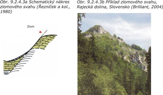 Zlomové svahy (obr. 9.2.4.3a,b) sledují tektonicky predisponované poruchy, tedy výškovou změnu reliéfu. Pro zástavbu jsou z důvodu nebezpečí zlomové aktivity, ale i značně strmých svahů často nevhodné.