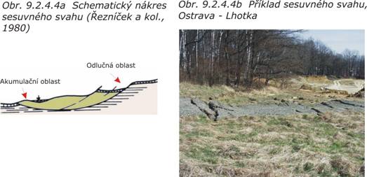 Sesuvné svahy (obr. 9.2.4.4a,b) jsou modelovány svahovými pohyby a mají často nepravidelně zvlněný povrch různého typu, tvaru a věku. Úložní poměry jsou neuspořádané, často s nepravidelným výskytem podzemní vody, a proto takové území neposkytuje příznivé podmínky pro stavební záměr.