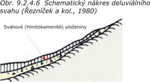 Deluviální svahy (obr. 9.2.4.6) u nás představují nejčastější typ svahu. Jsou pokryty svahovými uloženinami, jejichž povaha, vlastnosti a mocnost závisí na horninovém podkladu. Podmínky pro zástavbu se mění podle charakteru pokryvu a sklonu svahu.